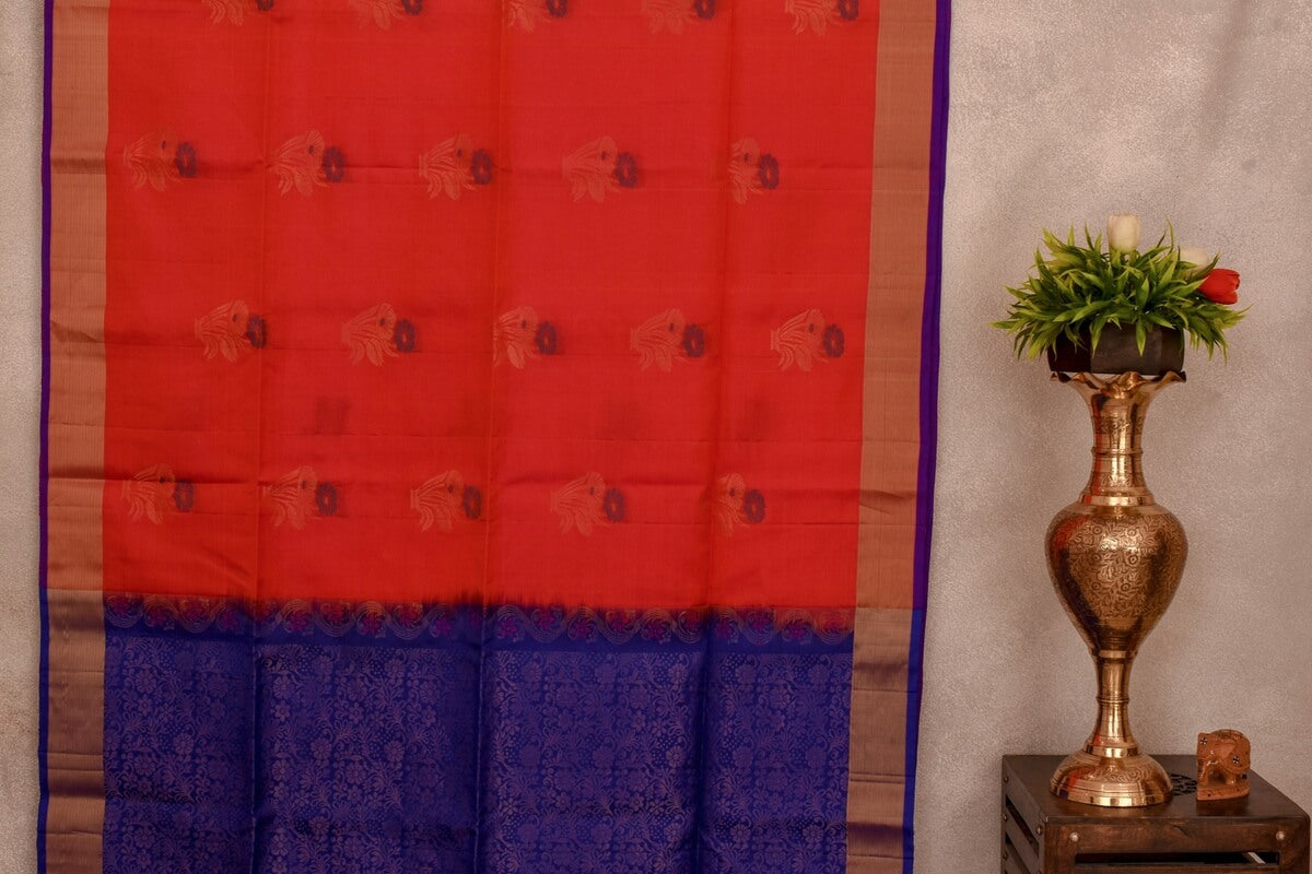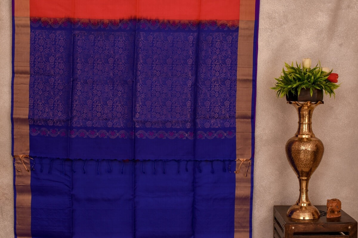 Experience the luxurious softness of this dual-tone pink and orange soft silk saree from A Silk Weave. Its deep blue paloo adds vibrant contrast, perfect for making a statement. Crafted of 100% silk, it's the ideal choice for all special occasions.