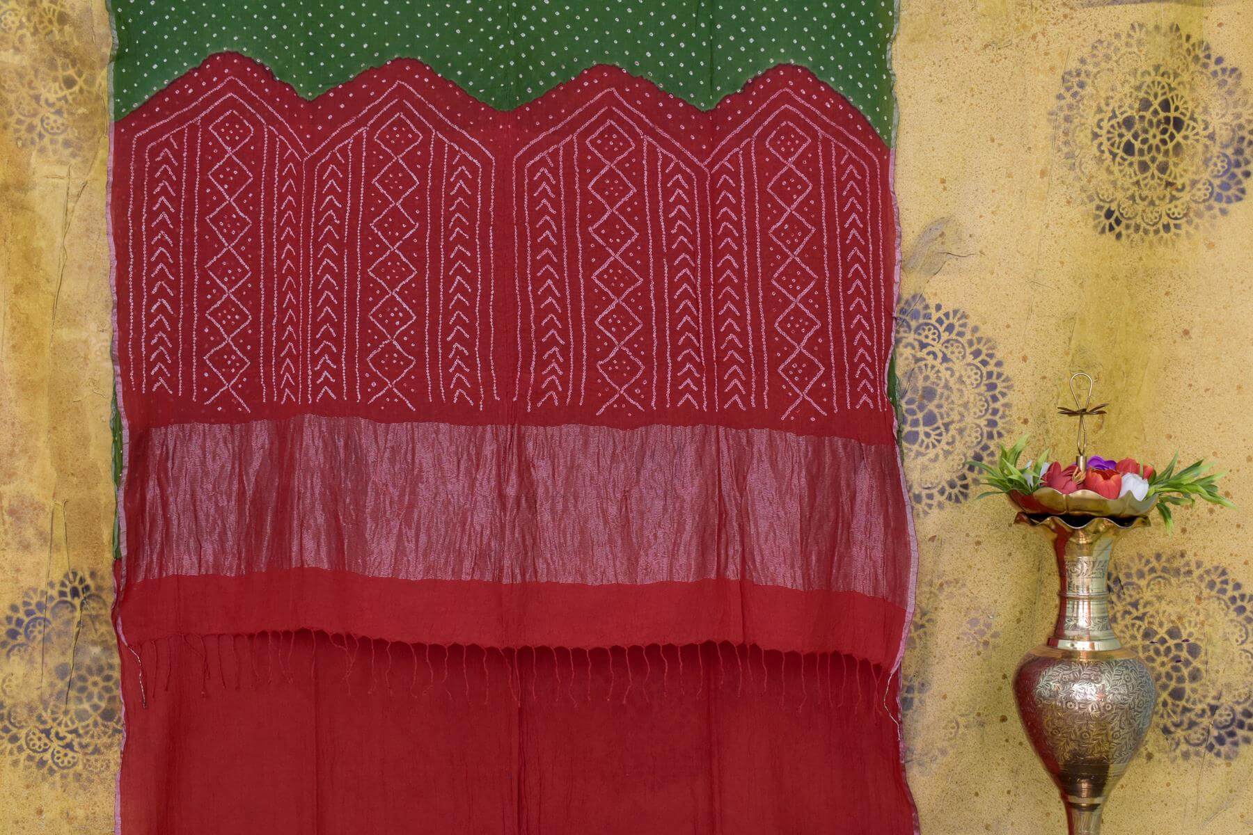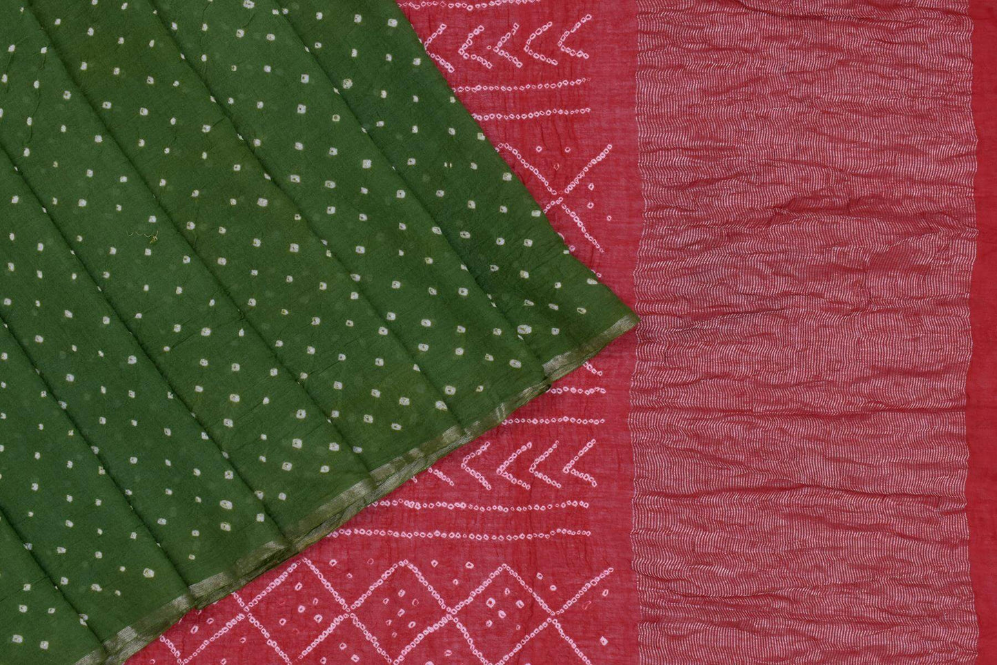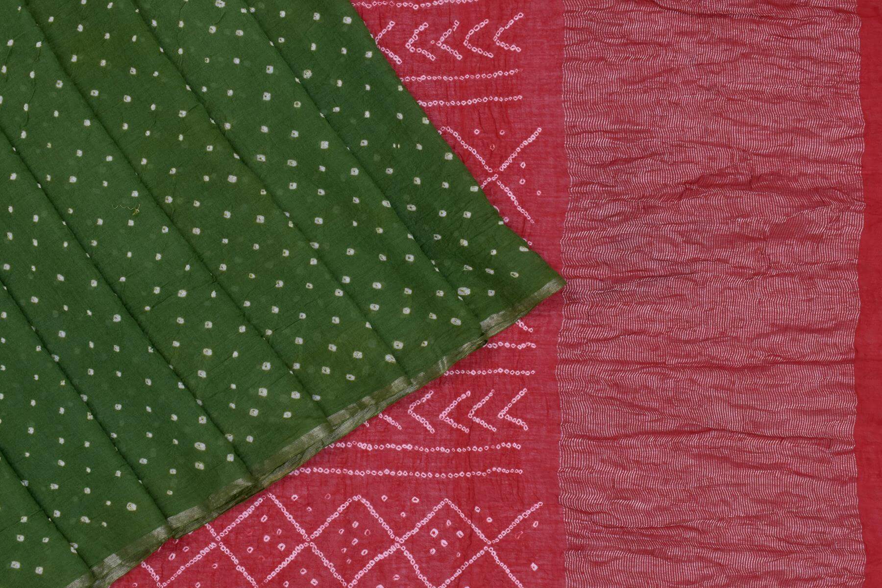 This Bandhani Khadi cotton Saree by Chakor features a vibrant green body with contrasting red borders, paloo, and blouse. Made from high-quality materials, this saree is both stylish and comfortable, perfect for any occasion. Elevate your wardrobe with this beautiful saree and make a statement wherever you go.