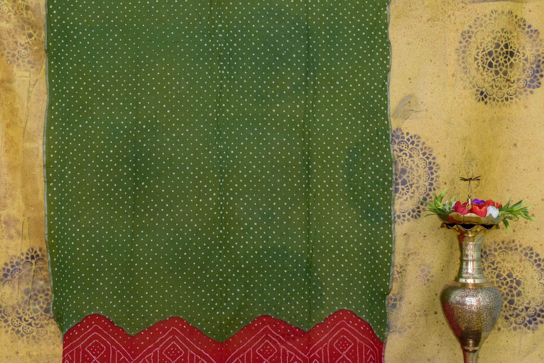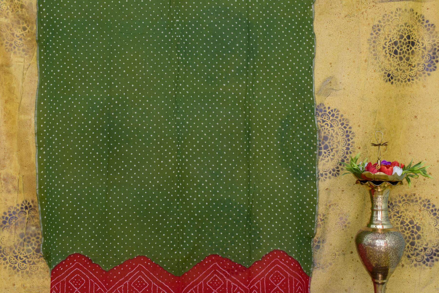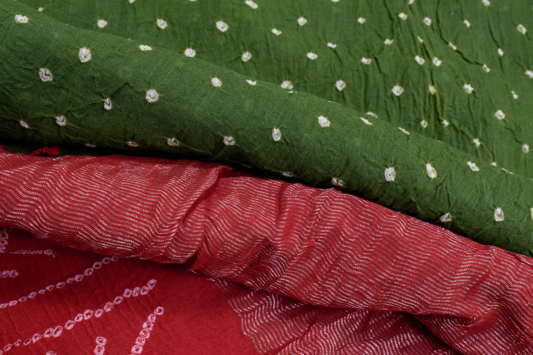 This Bandhani Khadi cotton Saree by Chakor features a vibrant green body with contrasting red borders, paloo, and blouse. Made from high-quality materials, this saree is both stylish and comfortable, perfect for any occasion. Elevate your wardrobe with this beautiful saree and make a statement wherever you go.