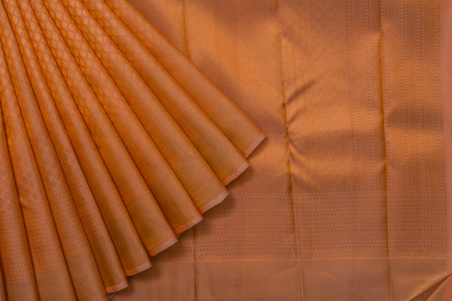 This elegant beige Kanjivaram silk saree exemplifies traditional South Indian craftsmanship. Meticulously woven with pure mulberry silk and adorned with signature gold zari work, it presents a sophisticated palette that enhances its timeless appeal. The distinctive temple border and intricate motifs showcase the authentic Kanjivaram weaving technique, creating a versatile heirloom piece suitable for ceremonies and cultural celebrations.