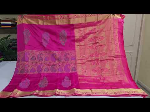 Block printed Pink Kanjivaram Silk Saree with Golden Zari Border