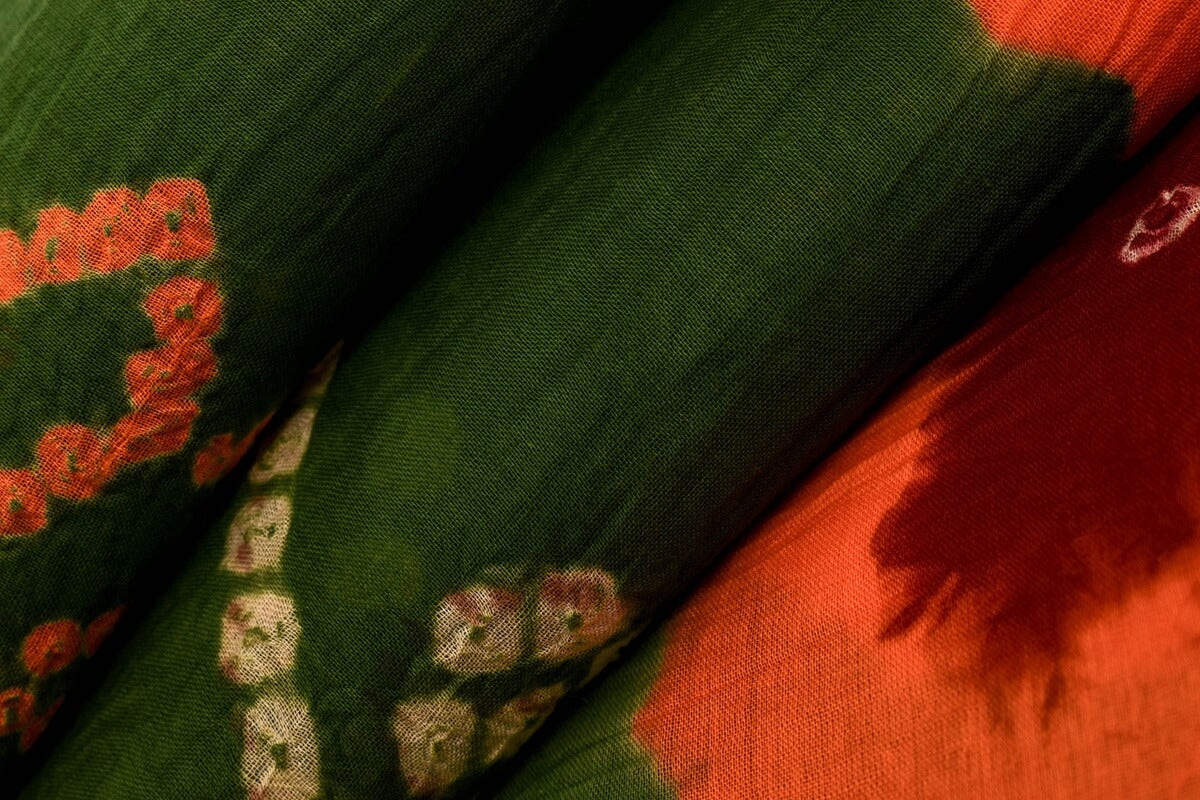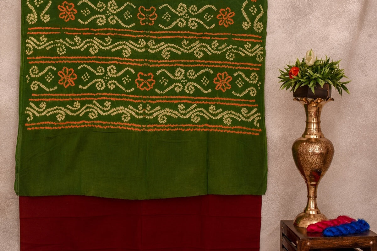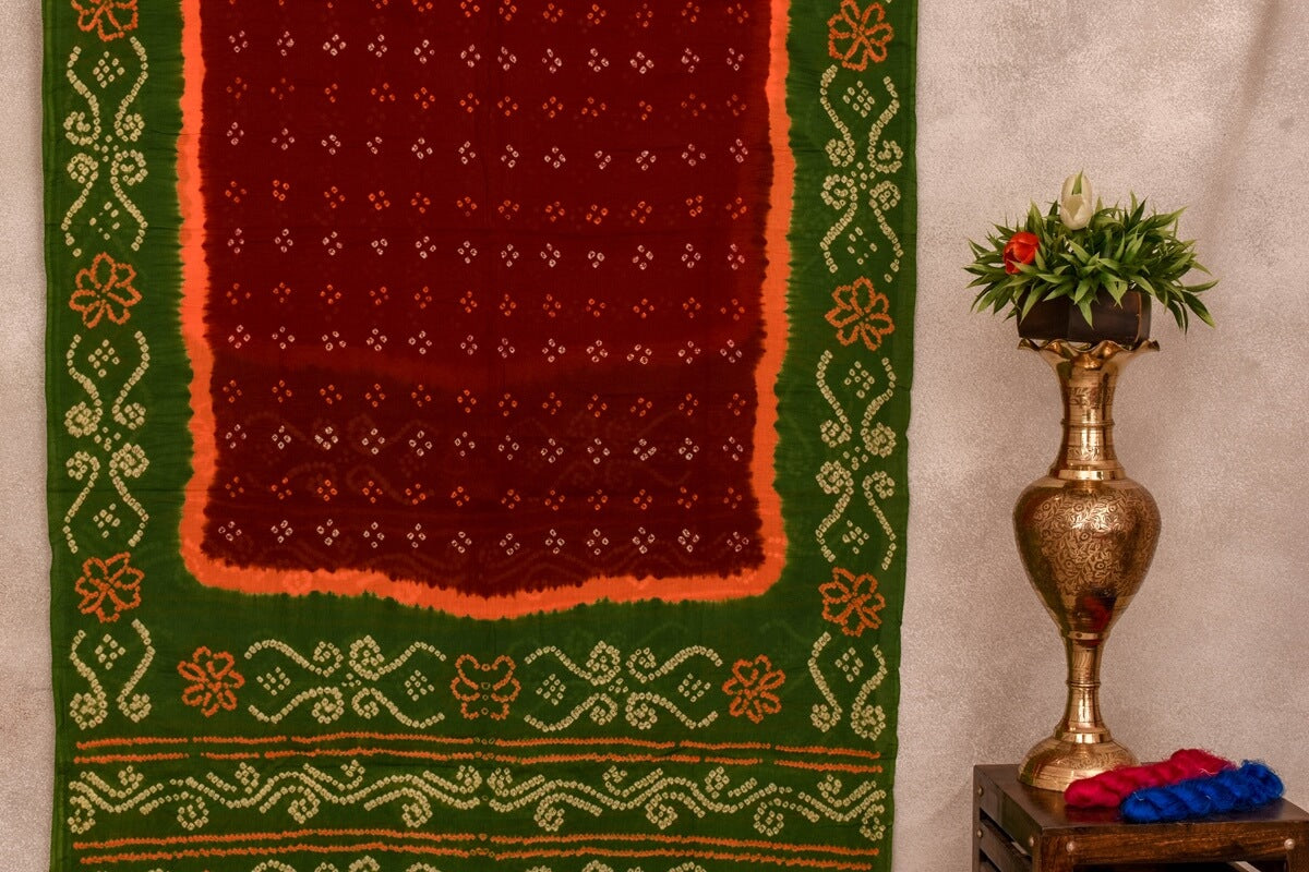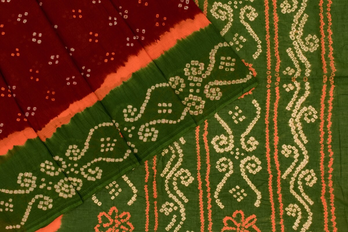 This traditional maroon Chakor Mul cotton saree is elegantly decorated with green bandhani borders. Crafted from lightweight Mul cotton fabric, it is comfortable to wear and perfect for any special occasion.