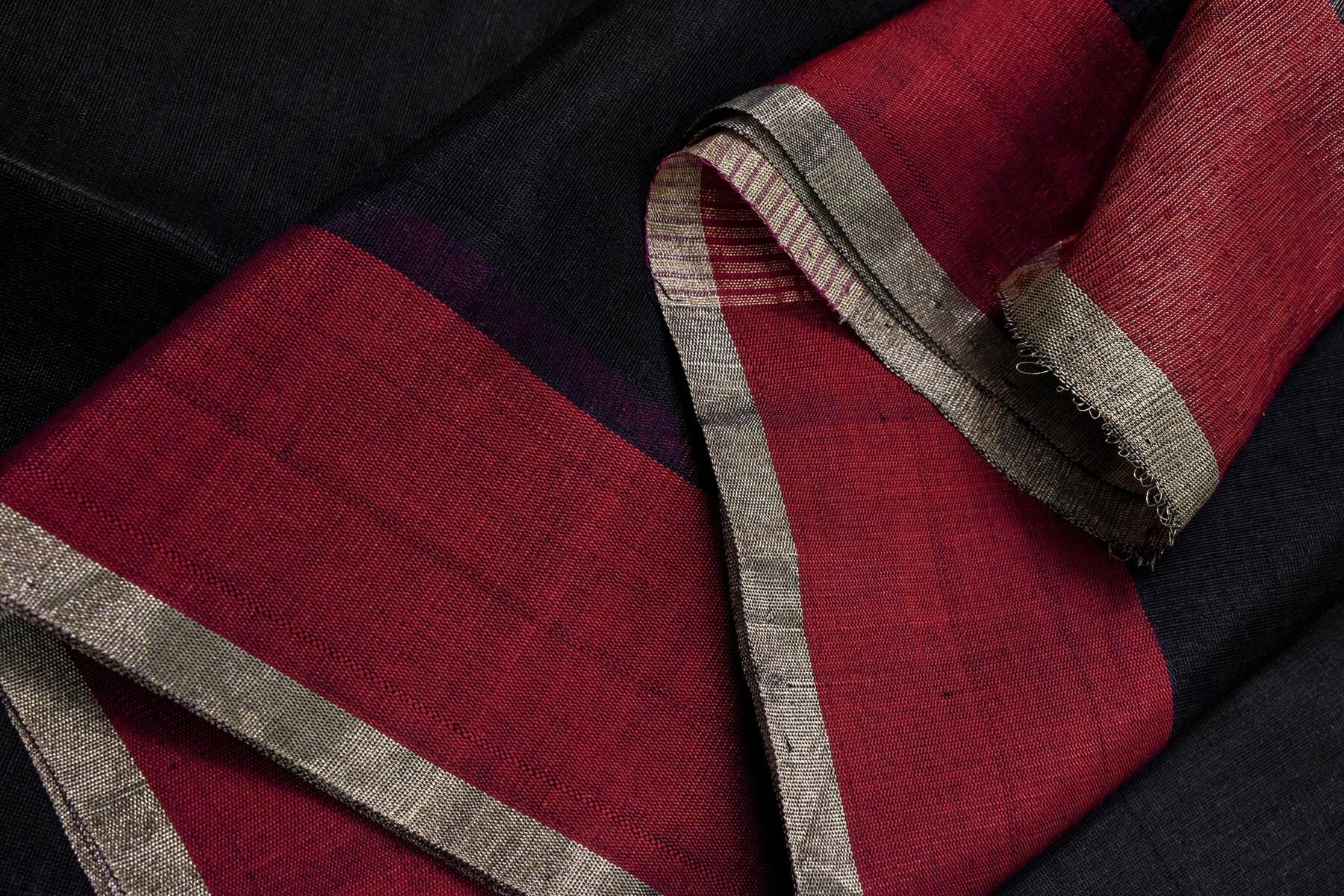 Expertly crafted with a blend of Chanderi and pure Silk Cotton, this stunning saree features a bold black body, with delicate pink and red borders. Complete with a matching palloo and blouse, this saree is the perfect blend of elegance and style.
