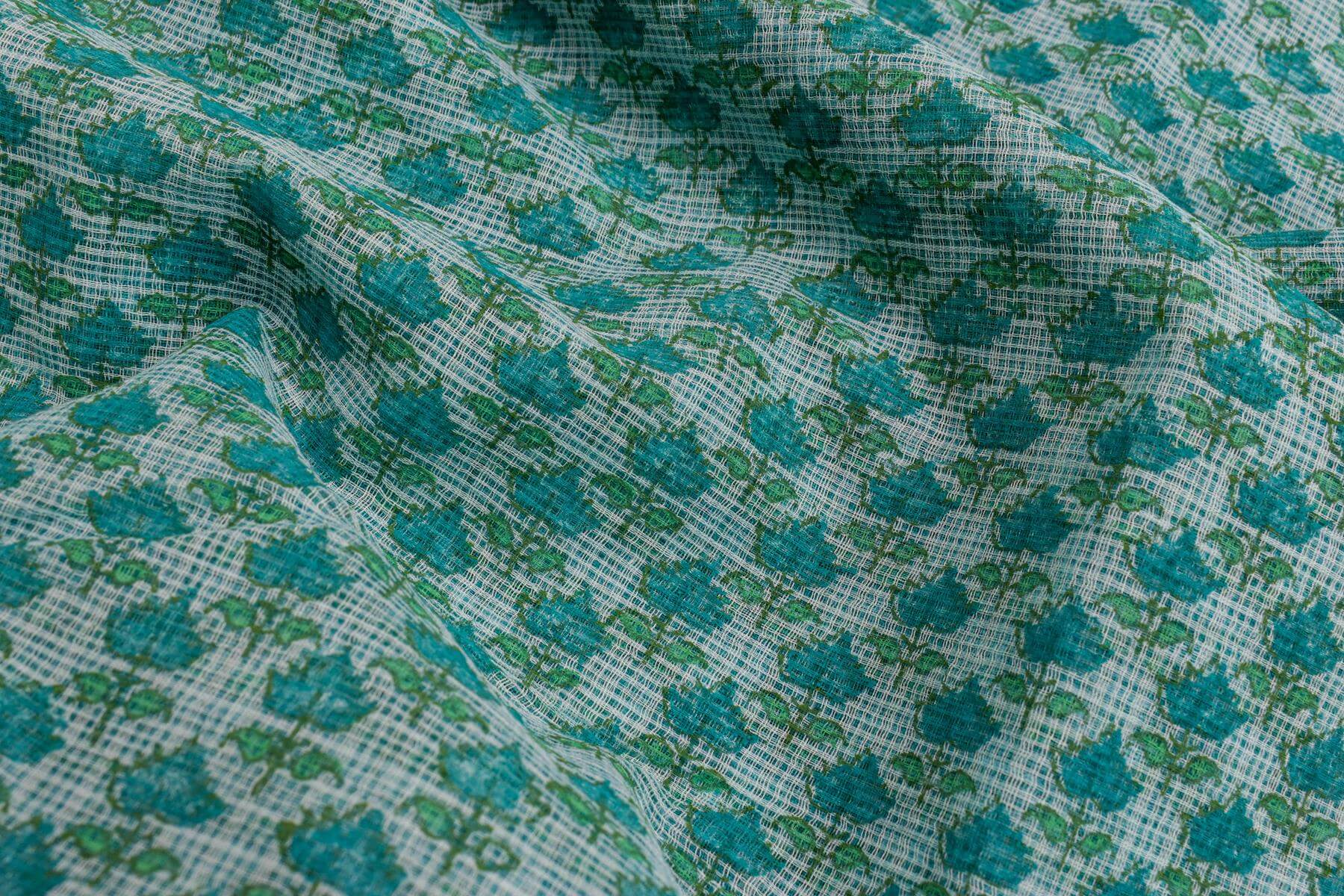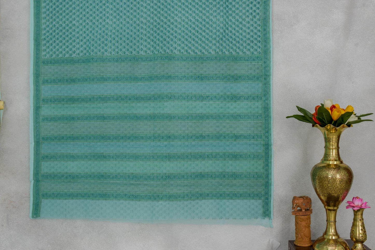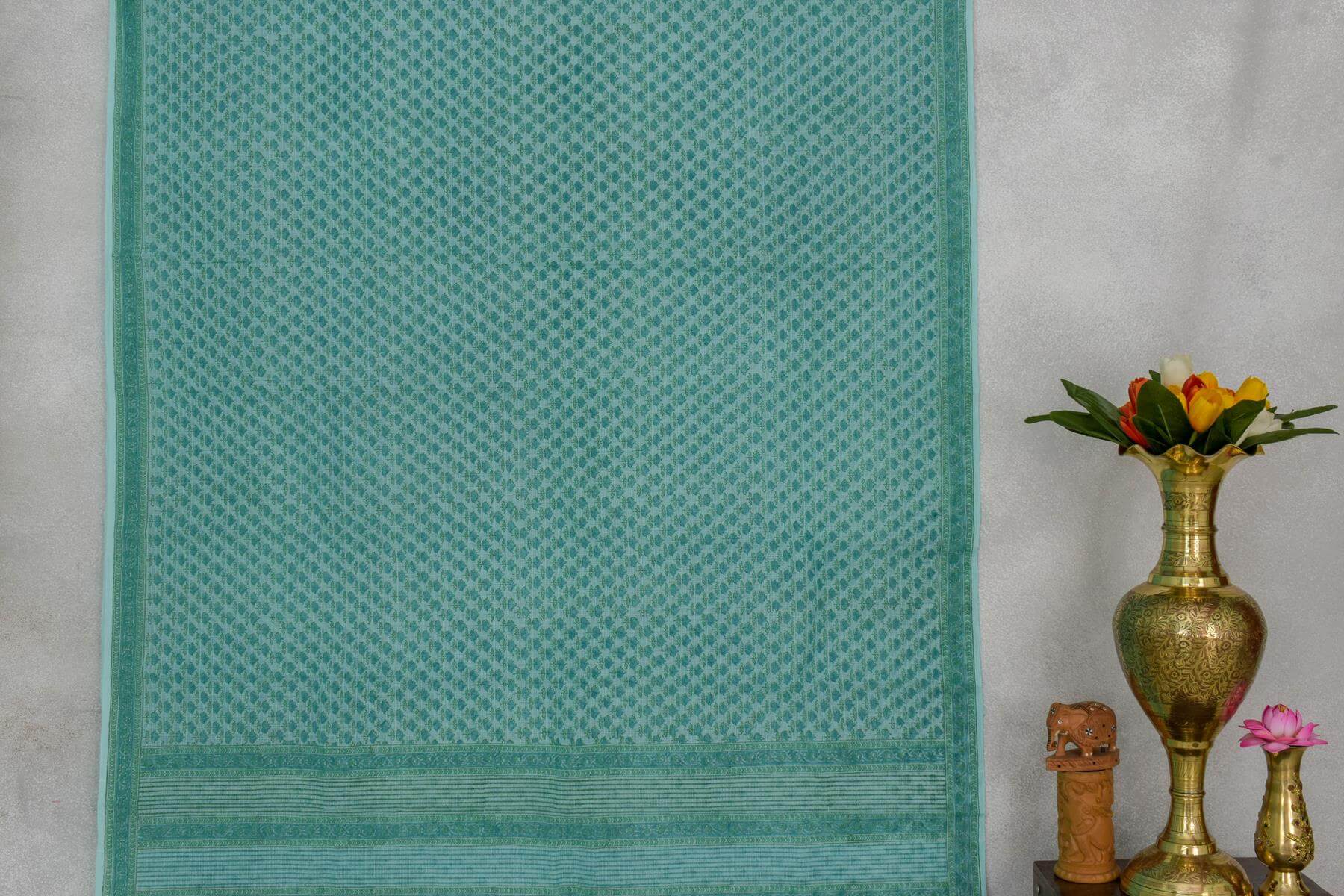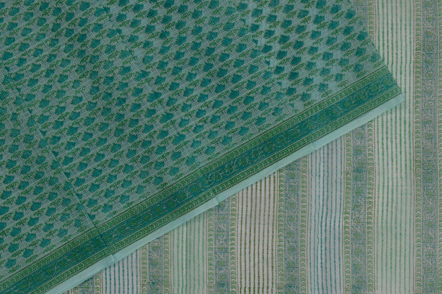 This Inheritance India cotton saree (PSSW290091) features a mild blue body with intricate hand-printed borders and paloo. The lack of a blouse accentuates the traditional and elegant design, perfect for any occasion. Made with high-quality materials, this saree is a must-have for any wardrobe.