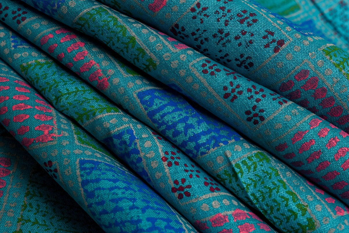 This stylish tussar silk saree is crafted with intricate and detailed hand-block printing. The subtle bluish green hue gives a unique and modern touch to the traditional style. This beautiful saree adds a luxurious touch with its elegant design and comfortable fabric.