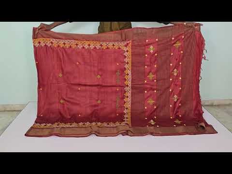 This Sameeksha Tussar Silk saree is made of high-quality maroon tussar silk with delicate hand embroidery, adding a touch of luxury and elegance to your wardrobe. Revamp your style with this unique and versatile saree that is perfect for any occasion.