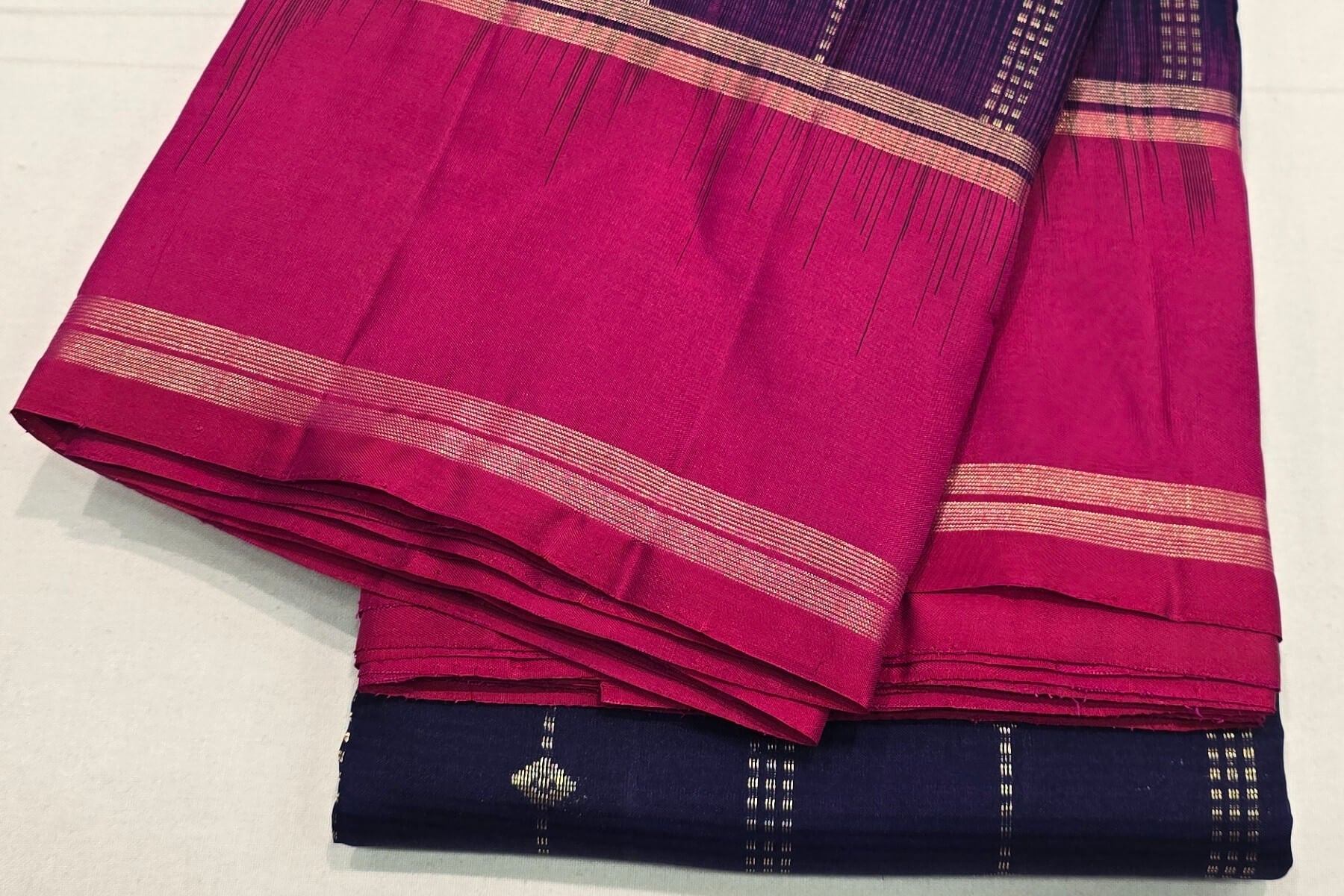 This lightweight Kanjivaram silk saree showcases a deep navy blue body paired with delicate pink borders, paloo, and blouse. Its elegant color combination and fine silk texture create a sophisticated ensemble, ideal for formal events and celebrations where timeless grace is desired.