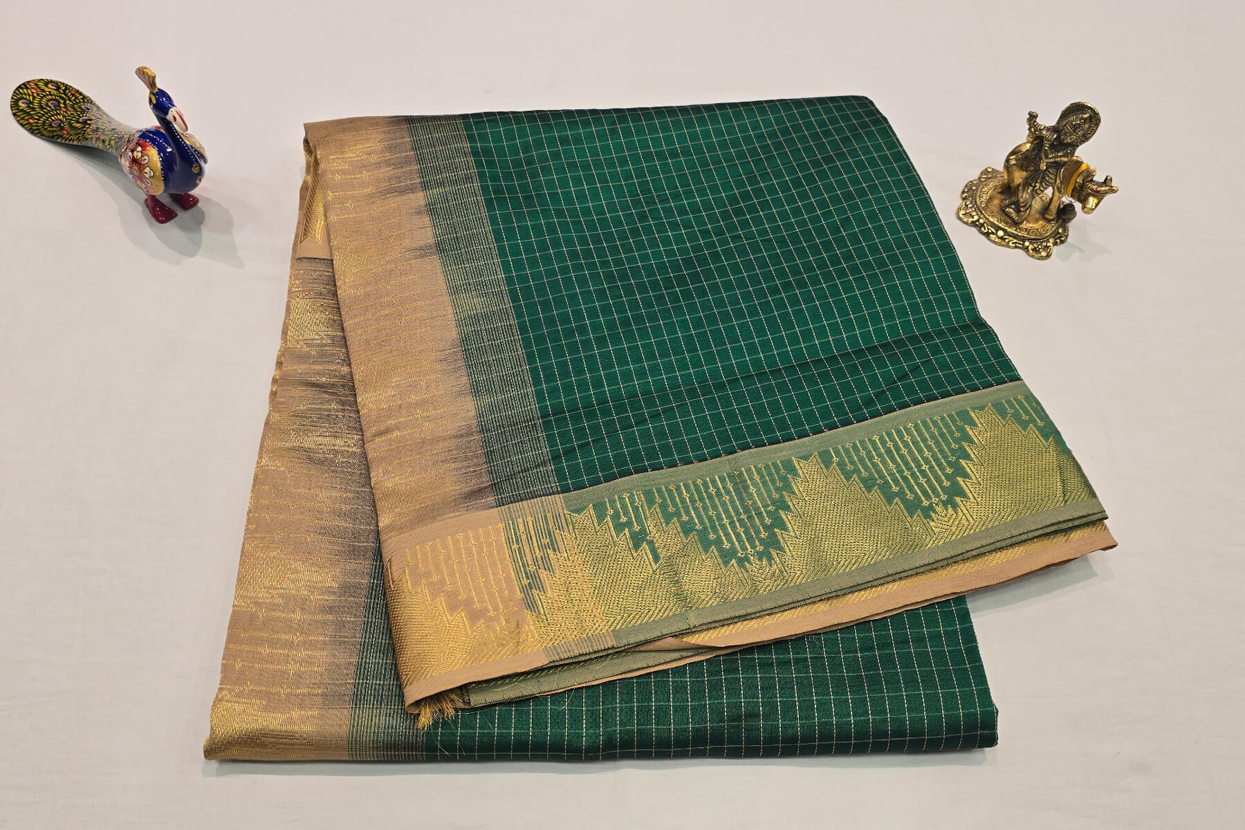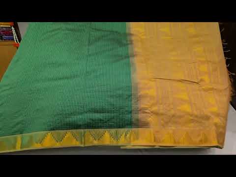 This semi silk cotton saree, brought to you by Shreenivas silks, features a beautiful leaf green body with self borders and a cream paloo. Perfect for any occasion, this saree does not include a blouse, giving you the freedom to choose your own. Elevate your style with this stunning saree.