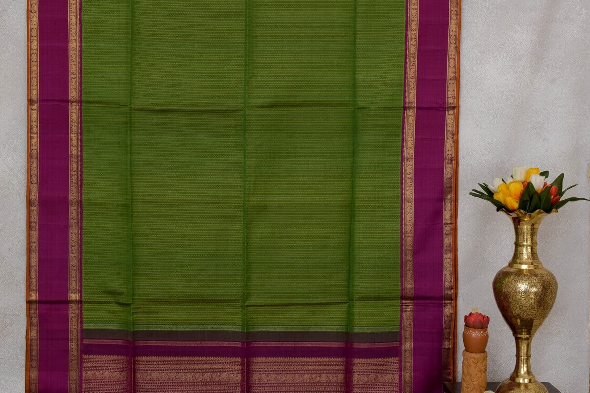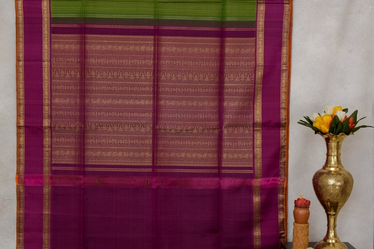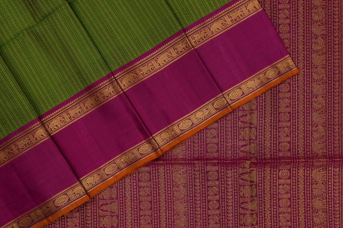 This classic Rutambhara Kanjivaram silk saree combines traditional techniques with modern design. The green-yellow combination features intricate thread work, with magenta borders for a striking look. Handcrafted by experts, this saree is perfect for a special occasion.