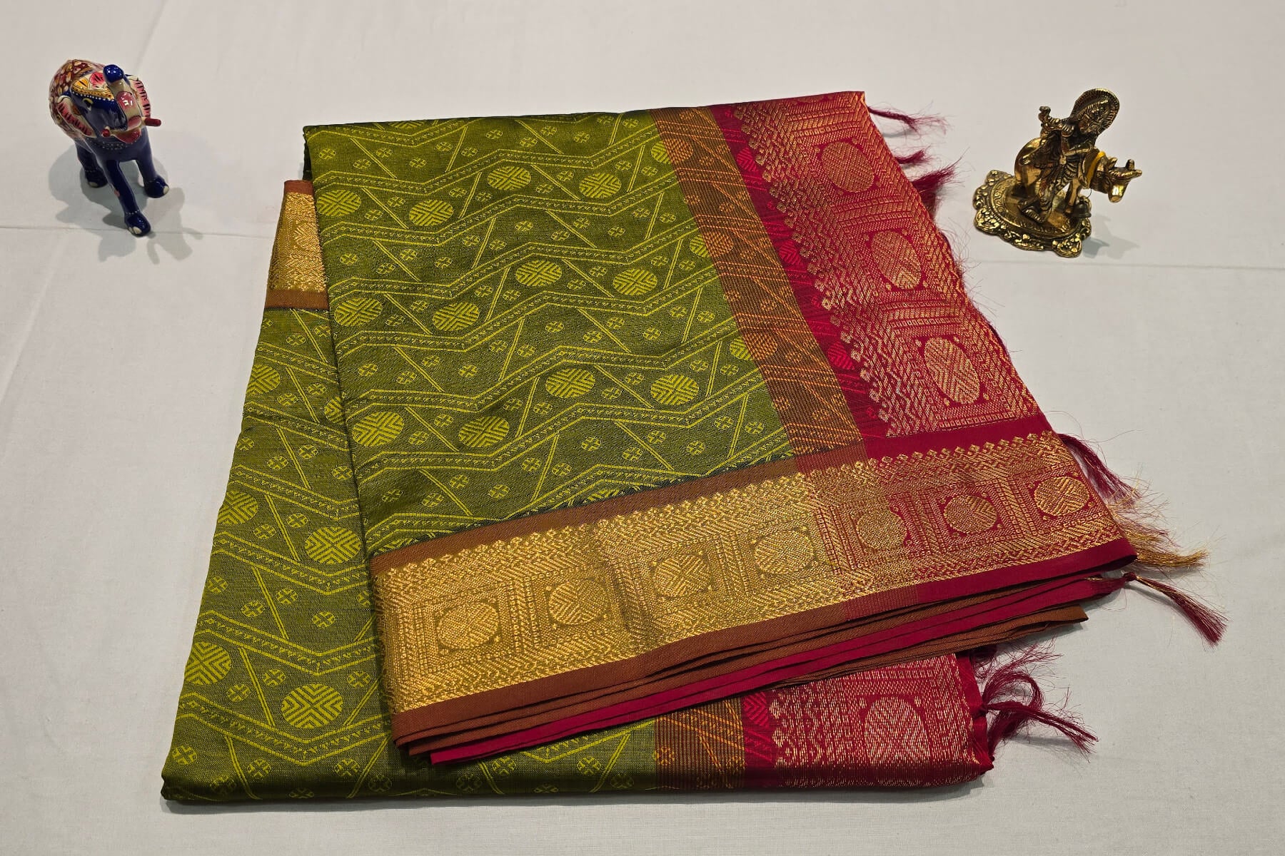This distinguished Semi Silk Cotton Saree by Shreenivas Silks showcases a sophisticated olive green body beautifully complemented by vibrant red borders. The coordinating red paloo and blouse piece create a striking contrast that embodies timeless elegance. Expertly crafted from premium semi silk cotton, this saree delivers the perfect balance of silk's luxurious sheen and cotton's comfortable wearability. The classic color combination makes this an exceptional choice for traditional ceremonies, festive celebrations, and formal occasions where refined style is essential.