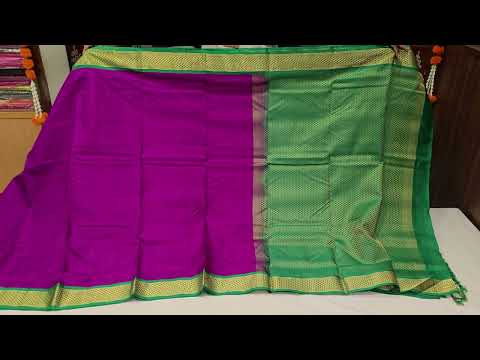 This sophisticated ten yards silk saree features a vibrant magenta body beautifully contrasted with leaf green borders and paloo. Designed without a blouse, it offers versatile styling options. The luxurious silk fabric ensures a smooth, elegant drape, perfect for refined occasions.