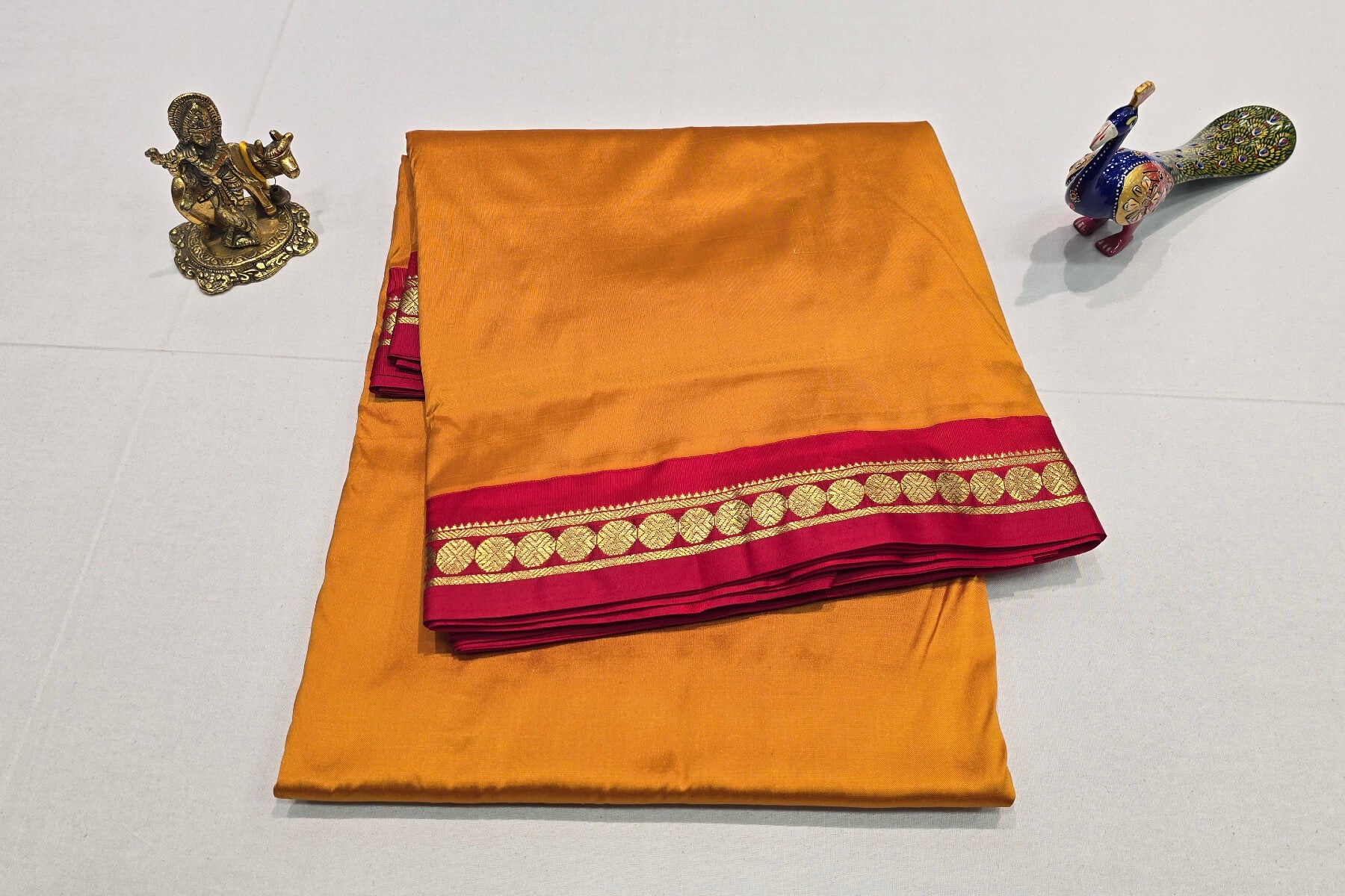 This elegant ten-yard silk saree from Shreenivas Silks showcases a vibrant mustard body paired with striking chilly red borders and a beautifully crafted plaoo. Offered without a blouse, it exudes refined sophistication, making it an ideal choice for graceful and memorable occasions.